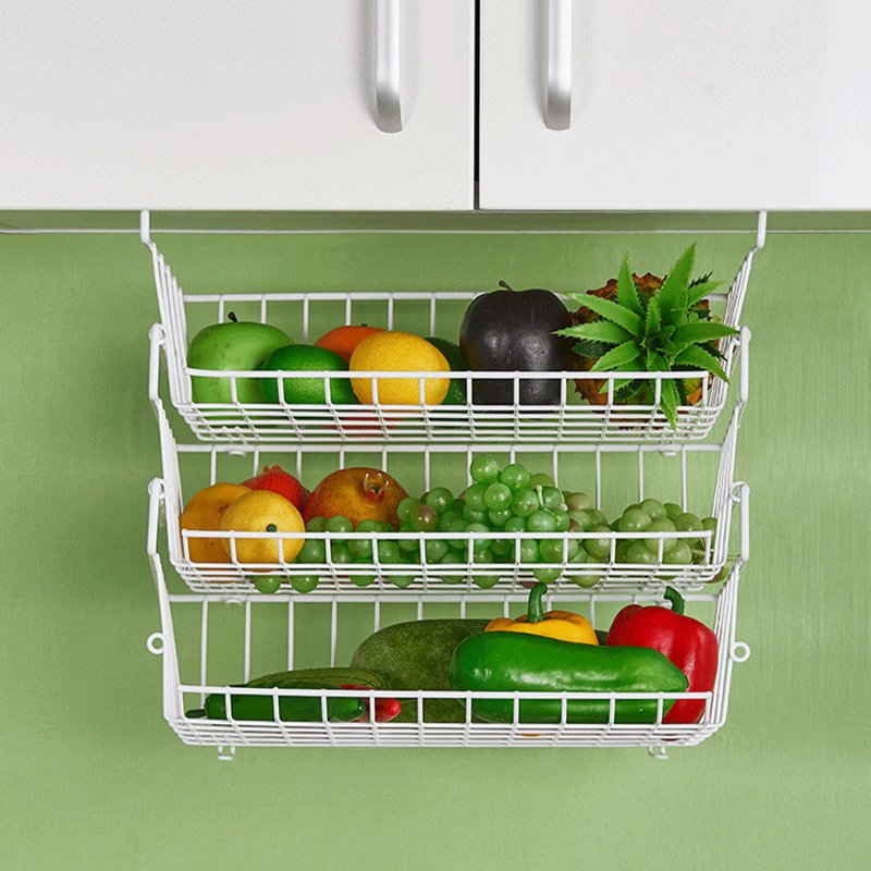 Multifunctional drill-free metal hanging baskets that can be freely combined in multiple layers, which can be hung on cabinets to store fruits and vegetables, in closets to store clothes, and under desks to store snacks