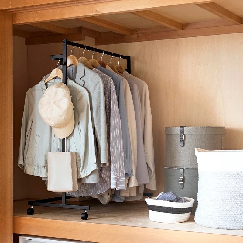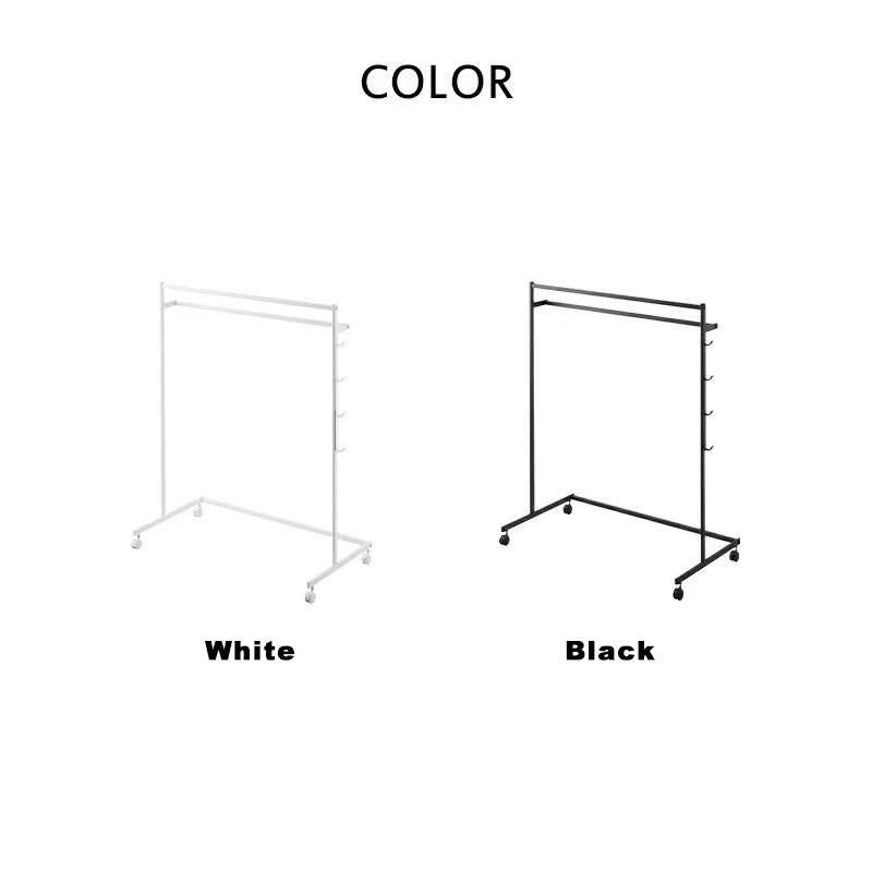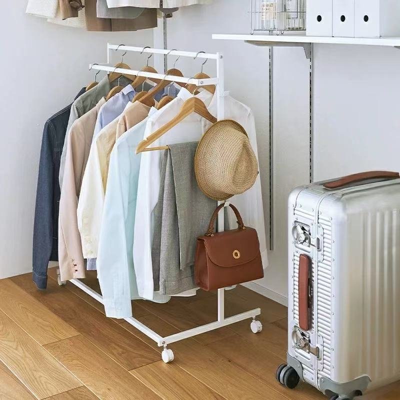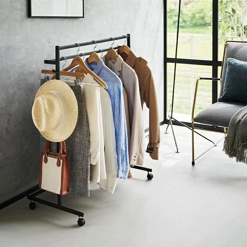 Simple double-rod clothes hanger, movable with pulleys, can be used to store clothes and placed on the balcony or in the bedroom